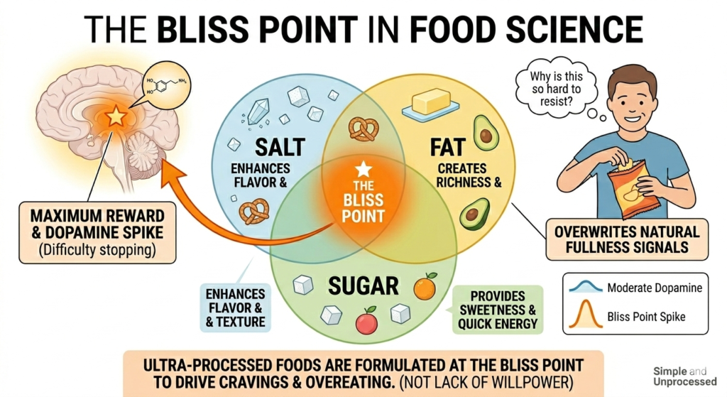 The bliss point is the precise level of sweetness, saltiness, and richness that maximizes pleasure without overwhelming you.